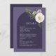 Prachtige witte florale met groen, geplaatst over een rijke paarse achtergrond, in een minimalistisch ontwerp... met uw gebeurtenisdetails in modern manuscript en klassieke doopvont, plaats binnen een diepere paarse boog. Eenvoudig. Elegant. Ideaal voor een winterbruiloft.