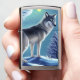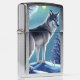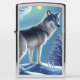Wolf houdt van Zippo, een aansteker met een kunstwerk van een grijze wolf in een winterscène. Pas het monogram met één letter aan uw behoeften aan.
