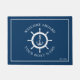 Elegant wit en marineblauw nautisch bootwiel en anker met aanpasbare tekst.