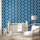 Wit bloemmotief op blauw behang