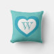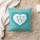 Dit kussen heeft een wit en turquoise hart met een monogram initiaal in het midden aan de ene kant en een herhaald turquoise hartpatroon aan de andere kant. Klik op "Aanpassen" om de achtergrondkleur te wijzigen en tekst te personaliseren.