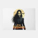 Gestileerde illustratie van een mysterieuze heks die onder een gloeiende volle maan staat, met vleermuizen die rondvliegen en een spookachtige 'Happy Halloween'-boodschap.