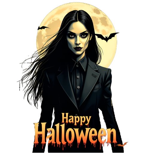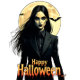 Gestileerde illustratie van een mysterieuze heks die onder een gloeiende volle maan staat, met vleermuizen die rondvliegen en een spookachtige 'Happy Halloween'-boodschap.