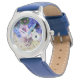 Elegant bloemhorloge, blauw, roze witte rozen en anemonen op grijze achtergrond met bedrukte roze edelstenen.