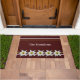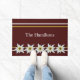 Europese geïnspireerde deurmat in donkerrood met witte Edelweiss-bloemen en gele en witte strepe accenten. Pas de witte douanetekst aan uw behoeften aan.