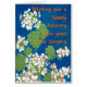 Een , bloemig 'Get Well'-wenskaart voor iemand die een knieoperatie ondergaat, met witte geraniums op een blauwe achtergrond, van een screenprint van Judy Adamson. U kunt uw eigen inside-bericht toevoegen.