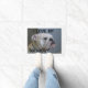 Witte hond houdt van piek deurmat