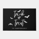 Welkom gasten met Halloween geest met behulp van deze moderne deurmat. Het ontwerp is voorzien van Trick or treat in helder wit script typografie met speelse bat silhouetten tegen een gedurfde zwarte achtergrond. Met een aanpasbaar tekstgebied onder het ontwerp kunt u een familienaam of een aangepast welkomstbericht toevoegen, waardoor het een unieke en feestelijke touch is voor uw ingang tijdens het spookachtige seizoen.