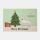 Destei's originele cartoon illustratie van een schattige witte Zwitserse Herder / witte kleur Duitse Herder rashond. De hond staat bij een feestelijke kerstboom versierd met rode en gele ornamenten, een witte parelslinger en een gele ster die op de top van de boom is geplaatst. Er zijn ook twee gewikkelde cadeaus bij de boom en achter de hond is een bruine plank met twee kaarsen. De kleur van de vloer is beige en de achtergrondkleur is lichtgroen. Er is ook een personaliseerbaar tekstgebied dat nu luidt: "Vrolijk kerstfeest!".