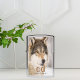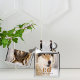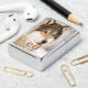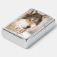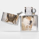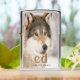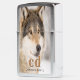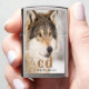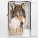 Close-up van een wolfskop in een Scandinavisch, Noords winterwoud. Een vriendelijk bijna lachend gezicht. Een dier met de vacht in zwart, wit en bruin. Personaliseer en voeg uw monogram initialen en naam toe. Gouden en zwarte blokletters.
