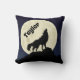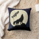 Show van je wilde kant met deze gepersonaliseerde gooienkussens. Het is voorzien van een silhouetstijl illustratie van een wolf in zwart klooien op een bleek gele maan, geplaatst tegen een middernacht blauwe nachtachtergrond, waardoor het perfect is voor iedereen die van dieren houdt. Deze kussen zijn klaar om met een naam of andere tekst te worden gepersonaliseerd.