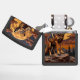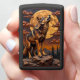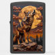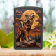 This lighter features a highly detailed, high-relief image of a reddish-brown wolf standing on a rocky outcrop. The wolf's head is tilted upward, engaged in a dramatic howl toward the enormous, textured yellow full moon. The setting features dark mountain silhouettes and pine trees against an orange and brown cloudy sky. The scene is rendered in an artistic style emphasizing relief and deep texture. The entire background landscape has a luxurious, soft-leather look. This artwork highlights the simple, yet profound acts of comfort and support provided by farming professionals, symbolizing warmth and peace. The highest quality print and artwork used on the surface is so exceptional it creates a stunningly realistic tactile illusion; you could easily mistake the textures for genuine leather. The entire design is set on a matte black lighter casing. The design may look real due to the high detail in the artwork.
