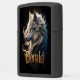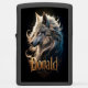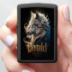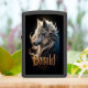 Een close-upportret van een wolf met een majestueuze bontmanen, het woord Donald staat in gouden letters onderaan.