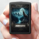 Een eenzame wolf huilt op een rotsachtige uitloper onder een volle maan. Sneeuwrijke bergen liggen op de achtergrond, met een serene rivier die door de beboste vallei stroomt