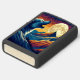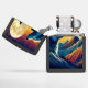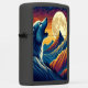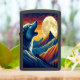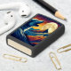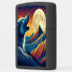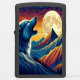 Een wolf huilt bij een volle maan in een sterrenhemel boven een bergketen. Het afbeelding is weergegeven in een kleurrijke, abstracte stijl.