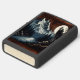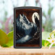 Een eenzame wolf staat op een rotsachtige afgrond, huilend naar een volle maan in een maanverlicht bos. De met sneeuw bedekte bergen stijgen in de verte op.