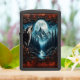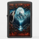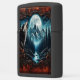 Een wolf huilt onder een volle maan, silhouet tegen een achtergrond van met sneeuw bedekte bergen en een kronkelende stroom, in een serene bosscène.