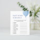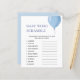 Voeg gelach en speelsheid toe aan je Baby shower met onze 'Word Scramble | Blue Balloon Baby shower Game". De gasten zullen veel plezier hebben bij het invullen van de lijst met woorden op deze kaart, allemaal gerelateerd aan baby's, die ze als eerste kunnen ontwarren! Haal de jouwe vandaag en creëer onvergetelijke herinneringen! Oplossing: 1. formule 2.pacifer 3.baby monitor 4.schommelstoel 5.swaddle 6.luier raffle 7.rubber ducky 8.kinderwagen 9.playpen 10.eosines