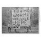 Een kleine jongen staat naast een handbeschilderd teken dat "wormen te koop" adverteren. 1935.