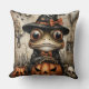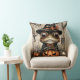 Warts & Wonders Sierkussen pet Een kikker met brede ogen in een zwart pak en met schedel bedekte heksenhouten zitstokken bovenop een gloeiende jack-o'-lantaarn, omringd door spookachtige figuren, verouderde papierresten en flikkerend lantaarnlicht. Met een tweede pompoen, een bungelende geest en verspreide Halloween-relikwieën in de buurt, combineert de scène gotische grillen met magisch onheil. Wervelende schaduwen en handgeschreven notities voegen mysterie toe aan dit betoverende moment van spookachtige stilte.