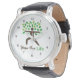 Een horloge met een groen en bruin ontwerp van een yoga krijger pose met bladeren die naar buiten spruiten en lijken op een boom. Boom staat voor leven. Deze illustratie is om te laten zien hoe het beoefenen van yoga en bemiddeling goed is voor de gezondheid en het welzijn in één leven en men yoga voor het leven zou moeten doen. Een passend ontwerp voor yoga-instructeurs en -docenten en iedereen die van het beoefenen van yoga houdt.