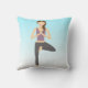 Mooie vectorillustratie van een bruine vrouw die yoga doet. De vrouw doet de boompoot en haar handen zijn in namaste. Ze draagt een lila shirt en een donkergrijze broek. De achtergrond is een mooi blauw verloop.