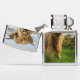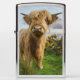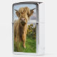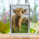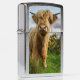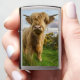 Een bevriende Schotse Schotse hoogland koe komt dicht bij zonsopgang. Je kunt zelfs zijn oog zien, dat meestal bedekt is door zijn gekwetste haar.