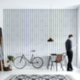 Zacht blauw en linnen gekleurd verticaal gestreepte behang met stoffige blauwe hand getrokken bogen.