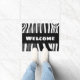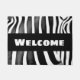 Zebra print met vetgedrukte tekst "Welkom". Funky deurmat in zwart-wit met de originele kunst van Alma Wad. Geweldig in elk modern huis waar retro-stijl items worden gewaardeerd.