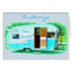personaliseren door te veranderen in jouw naam, het klassieke ontwerp van de reisaanhangwagen op om het even welke kleurenachtergrond