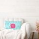 Een warm roze aangepast monogram lijst bevindt zich op een achtergrond van witte en turquoise zigzags.