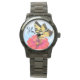 Butterfly op zinnia, natuur geïnspireerd polshorloge. Blauwe lucht achtergrond en zwaluwstaart vlinder eten van een felrode zinnia bloem is het afbeelding met een plaats voor haar voornaam initiaal. Getoond met een zwarte band of kies uit de vele andere kleuren en design. Ideaal voor een vrouwelijke tuinman en / of natuur liefhebber.