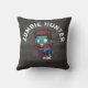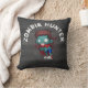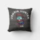 Een macabere kussen met een coole, uitziende zombie, met geknipte en getatoedeerde kleding met wapens die uitgestrekt zijn en op zoek zijn naar broederijen. Grote open ogen met een sikkelgroene roterende huid. Bloedsplatters achter zijn hoofd. De tekst zegt zombie hunter, in gekromde letters. Plaats op een zwarte achtergrond van houtskool.