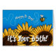 "Happy B-day - het is je 65ste!" Een schattige verjaardagskaart met een bij die over een rij zonnebloemen vliegt.