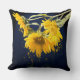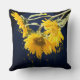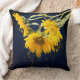 Drie bloeiende zonnebloemen met hun kop omlaag met een artistieke aanraking van de gele bladen die op de grond druppelen op zwarte achtergrond en een donkerblauw boogeffect