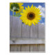Heldere gele zonnebloemen die boven een houten omheining hangen.