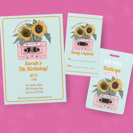 Een roze cassette en zonnebloemen maken deze trouwlied aanvraagkaarten leuk en funky. Vind overeenkomende objecten in mijn winkel.