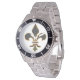 Het horloge van dit man heeft een zwart en gouden fleur-de-lys om bij te dragen aan zijn elegante stijl. De Fleur-de-lis is een religieus symbool dat de Heilige Drievuldigheid vertegenwoordigt. De Fleur-de-lis heeft vele interpretaties die verband houden met de bekering van de Franse monarchie tot de Christelijke religie en zegeningen van de Maagd Maria.