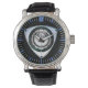 Horloge met een zwart lederen bandje en het afbeelding van een rotar op de achtergrond