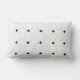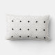 Een modern kunstdeco zwart-wit ontworpen rechthoekige kussen bestaande uit grote zwarte omhulde witte vierkantjes met kleine zwarte vierkantjes die geometrisch tussen de grotere vierkantjes zijn verdeeld.