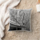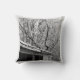 Dit kussen is voorzien van een zwart-wit foto van een besneeuwde rustieke scène tijdens een winter storm samen met aanpasbare tekst op de achterkant.
