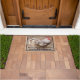Een gespikkelde zwarte en witte rooster versiert deze leuke deurmat die zegt: "Welkom bij onze coop."