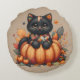 Zwarte kat op pompoen met herfst quilt patroon rond kussen